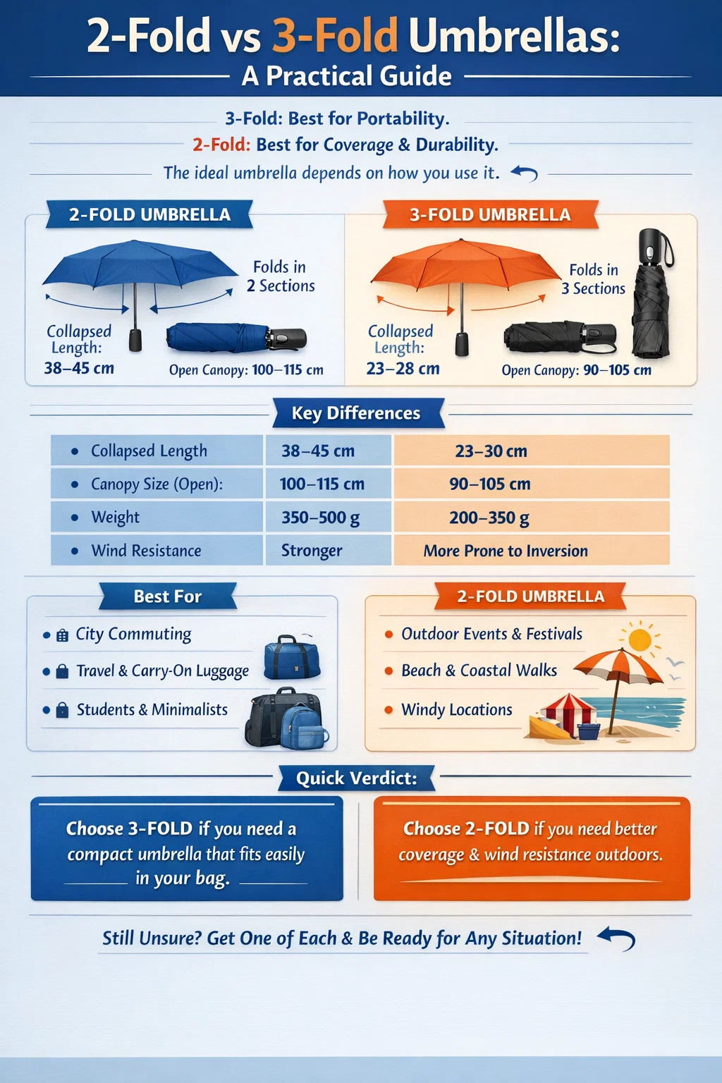 إذا كنت بحاجة إلى مظلة للتنقل اليومي أو الاستخدام المكتبي أو السفر حيث تكون مساحة الحقيبة ضيقة، دائمًا ما تكون المظلة ثلاثية الطيات هي الخيار الأفضل . يمكن طيه إلى ما يقرب من 23-28 سم، ويمكن وضعه في جيب السترة أو حقيبة اليد الصغيرة، وهو خفيف بما يكفي لحمله دون أن يلاحظه أحد. من ناحية أخرى، إذا كنت تقضي الكثير من الوقت في الهواء الطلق - سواء كنت متوجهاً إلى الشاطئ أو الملعب أو معرض ريفي - فإن المظلة ذات الطيين تمنحك مظلة أكبر بشكل ملحوظ، وإطارًا أكثر ثباتًا، ومقاومة أفضل للرياح، على حساب كونها أكبر حجمًا عند حملها.