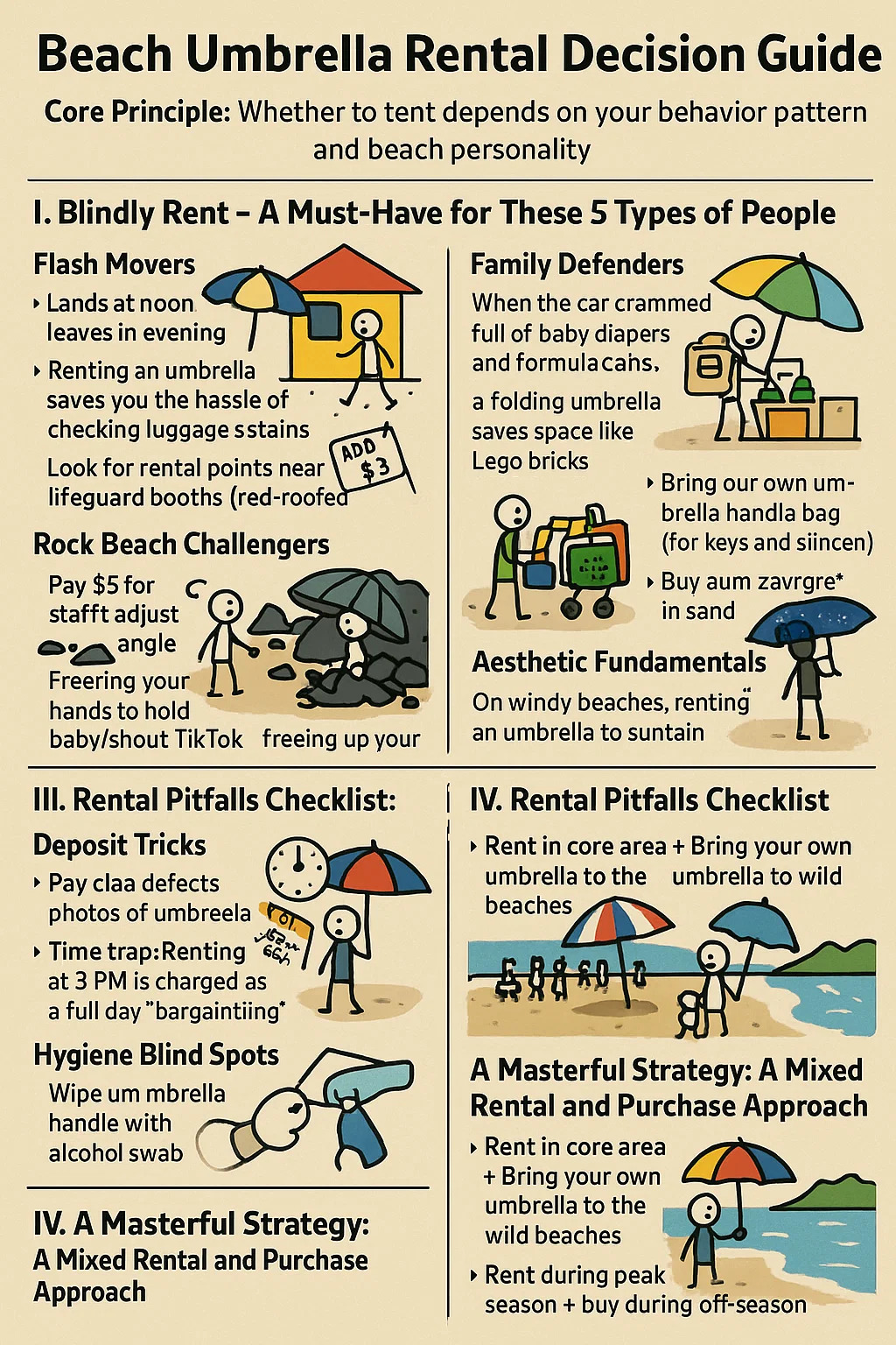فخ الوقت: يتم احتساب الإيجار عند الساعة 3 مساءً ليوم كامل → تكتيكات المساومة: "نصف سعر مظلة غروب الشمس؟"