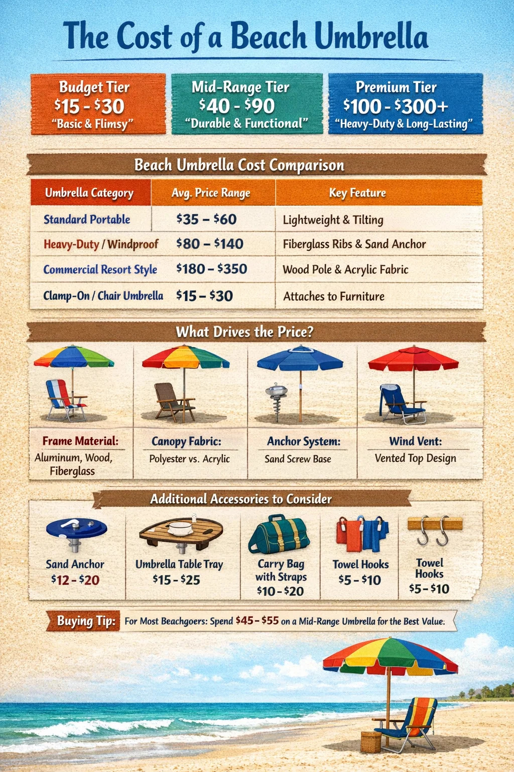 إذا كنت متجهًا إلى الشاطئ، فهذا معيار وموثوق تتراوح تكلفة مظلة الشاطئ عادةً ما بين 35 دولارًا و75 دولارًا . تغطي شريحة الأسعار هذه بشكل عام النماذج ذات المظلة التي يتراوح طولها من 6 إلى 7 أقدام، وآلية إمالة أساسية، وبطانة حماية من الأشعة فوق البنفسجية مطلية بالفضة. ومع ذلك، فإن السوق واسع. يمكنك العثور على مظلات "يمكن التخلص منها" للمبتدئين في متاجر الممرات المحلية مقابل أقل من 100 دولار 15 دولارًا إلى 25 دولارًا ، في حين أن هياكل الظل التجارية المتطورة المصممة لتحمل الرياح العاتية يمكن أن تصل أسعارها إلى 150 إلى 300 دولار أو أكثر .