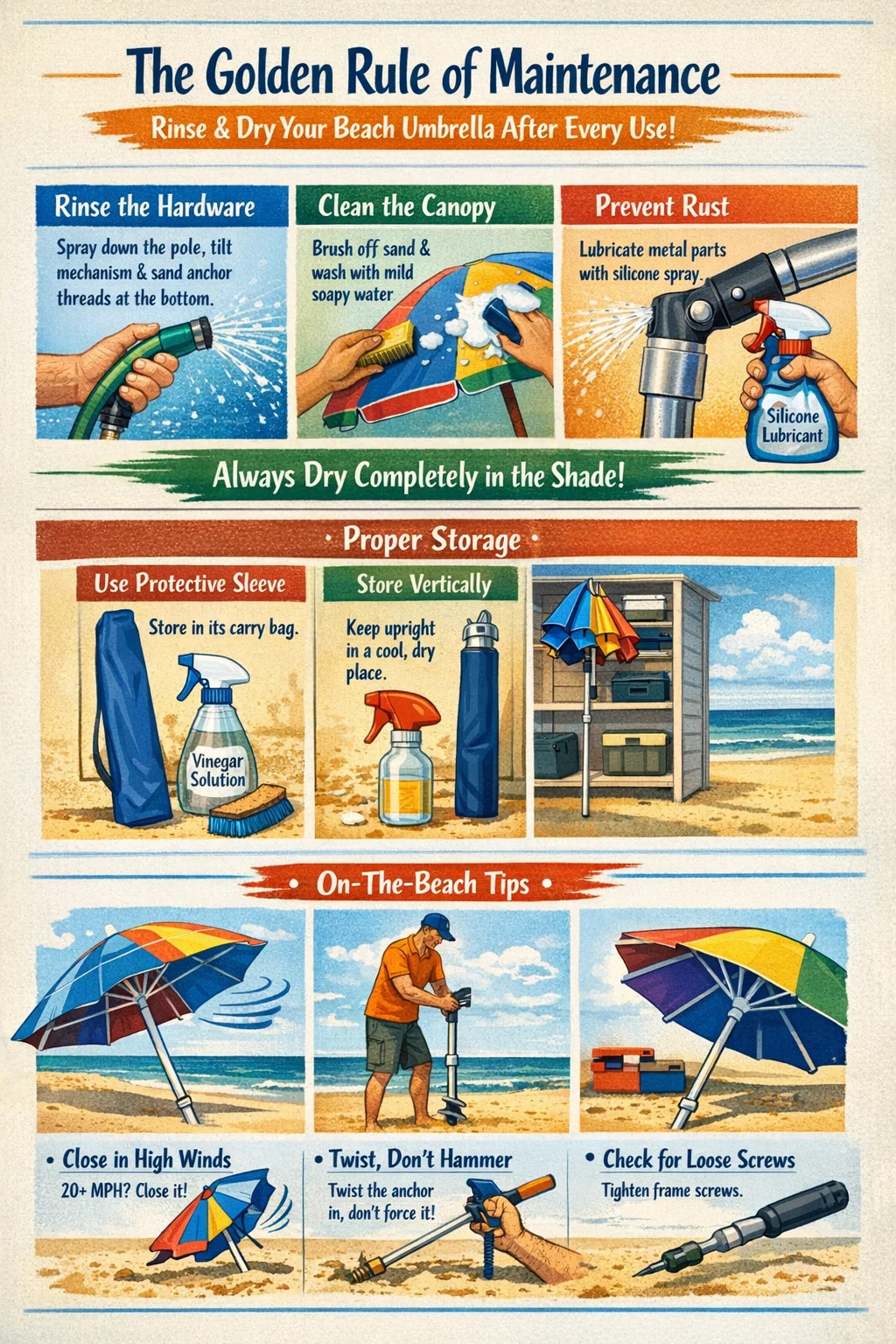 بالنسبة للمظلات ذات الأعمدة المعدنية، يتم تطبيق أ مادة تشحيم السيليكون البحرية على المفاصل مرتين في الموسم يمكن أن يمنع تأثير "القفل" الناجم عن الأكسدة. لا تستخدم أبدًا WD-40 للتخزين طويل الأمد لأنه قد يجذب المزيد من الغبار والرمل؛ التمسك بخاخات السيليكون الجافة.