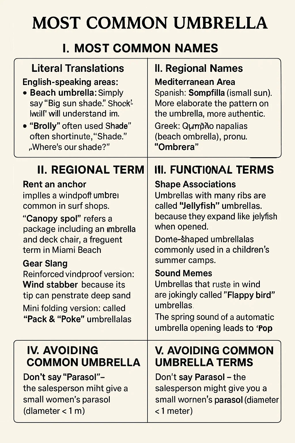 فيما يلي الأسماء الشائعة لـ مظلات الشاطئ في سياقات مختلفة: