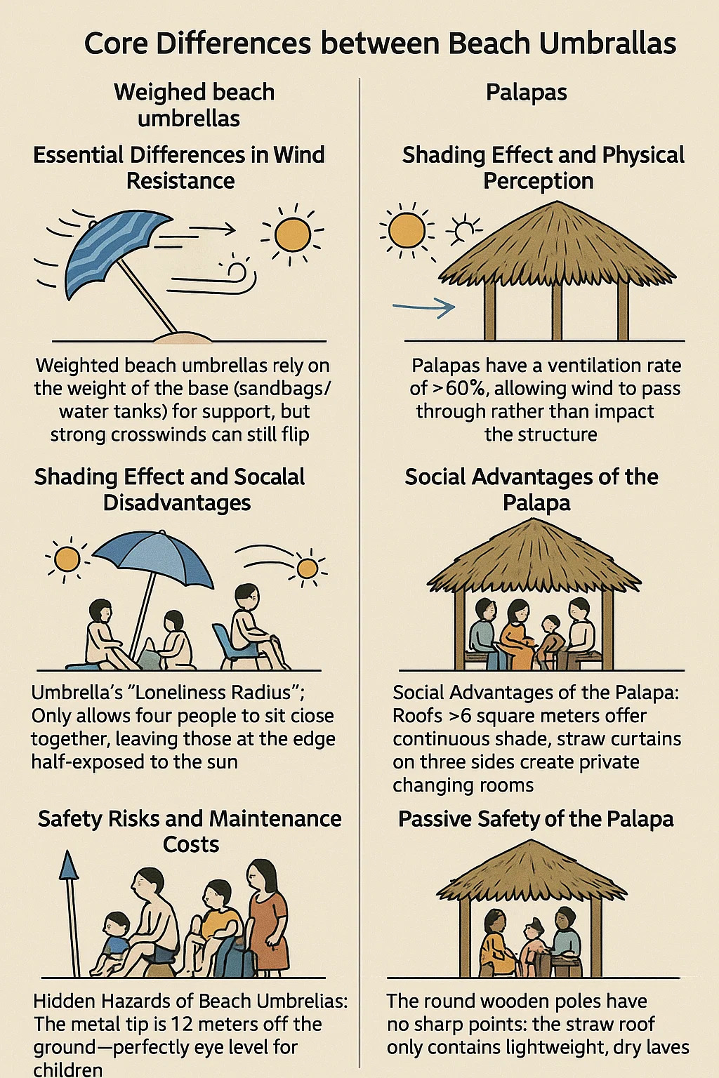 قيود الحماية من أشعة الشمس في مظلة الشاطئ: يتغير الظل الموجود أسفل المظلة مع زاوية الشمس، مما يتطلب تعديلات متكررة. يعكس الطلاء الفضي الإشعاع الحراري من الأرض بشكل غير فعال، لذلك حتى عند الظهر عندما يكون سطح الرمال 60 درجة مئوية، يمكن أن تتجاوز درجة الحرارة تحت المظلة 40 درجة مئوية. توفر Palapas تبريدًا طبيعيًا: حيث تمتص سعف النخيل السميكة الحرارة بدلاً من عكسها، مما يحافظ على مستوى رطوبة ثابت (يتم قياسه على الشاطئ، وهو أقل بمقدار 3-5 درجات مئوية عن تحت المظلة)؛ ظلة كاملة لا تتطلب أي تعديل.